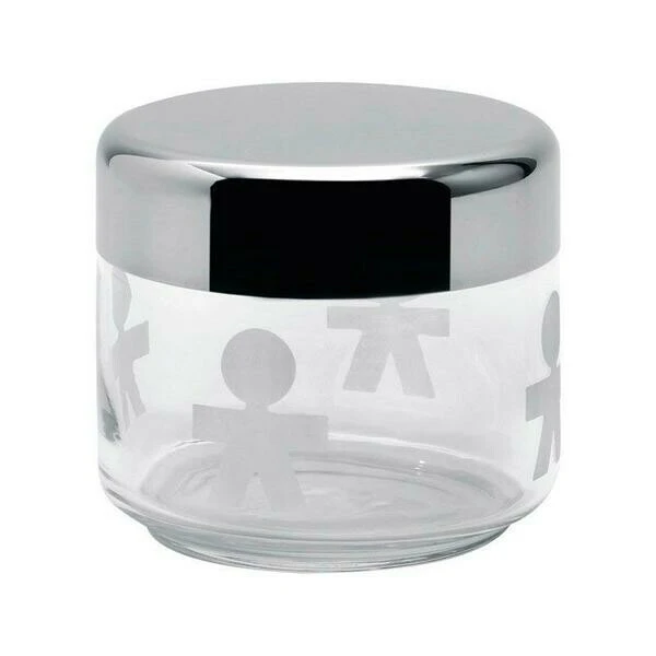 In den Küchendosen Girotondo von Alessi passen allerlei Lebensmittelvorräte hinein. Die schlicht geformten Glasdosen in verschiedenen Größen sind mit weißen Strichmännchen verziert, die diese Kollektion so besonders machen. Mehrere dieser transparenten Boxen im offenen Küchenregal bieten jederzeit Einblick und sind auch optisch ein Blickfang. Glanzvolles Highlight sind die Deckel aus poliertem Edelstahl.