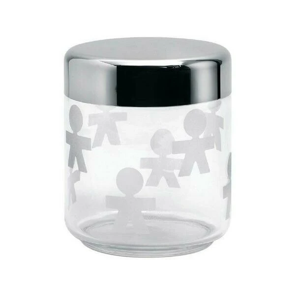 In den Küchendosen Girotondo von Alessi passen allerlei Lebensmittelvorräte hinein. Die schlicht geformten Glasdosen in verschiedenen Größen sind mit weißen Strichmännchen verziert, die diese Kollektion so besonders machen. Mehrere dieser transparenten Boxen im offenen Küchenregal bieten jederzeit Einblick und sind auch optisch ein Blickfang. Glanzvolles Highlight sind die Deckel aus poliertem Edelstahl.