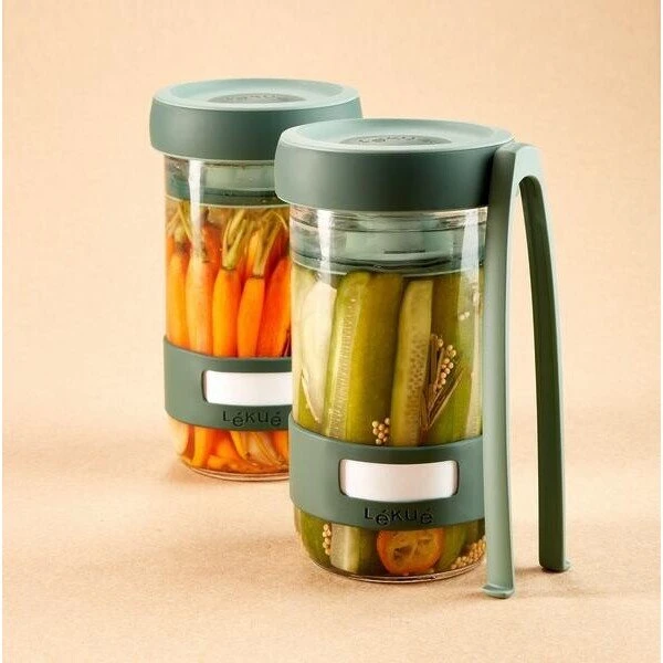 Das hochwertige Einlege-Set Kit Pickles von Lékué hilft Ihnen bei der einfachen Fermentierung von Lebensmitteln bei sich zuhause. So steht dem Einmachen von eingelegten Gurken, Maiskolben oder Minikarotten nichts mehr im Wege.
