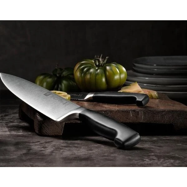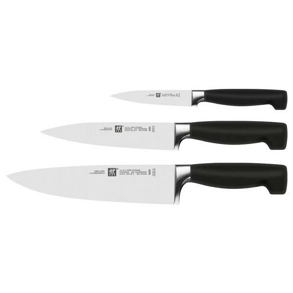 Das dreiteilige Messer-Set Vier Sterne von Zwilling bestehend aus einem Spick- und Garniermesser, einem Fleischmesser und einem Kochmesser sind Sie bestens ausgerüstet in Ihrer Küche und können von filigran bis grob alles schneiden – Gemüse, Obst, Fisch und Fleisch.